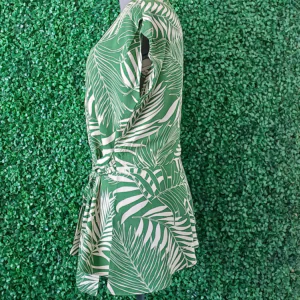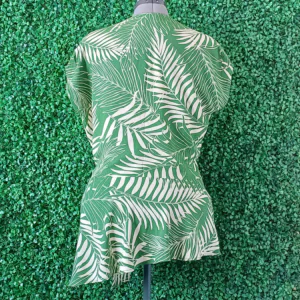 Leveza e charme em uma peça atemporal. A Blusa Basque Émeraude é confeccionada em viscose de toque suave, com estampa elegante em tons de verde e bege. O recorte godê na barra traz movimento e feminilidade, ideal para composições versáteis e refinadas.